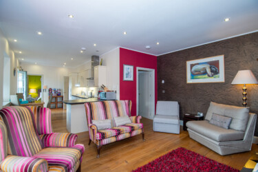 The spacious kitchen/dining area and lounge is fully equipped including a dishwasher and a Dolce Gusto Nescafe coffee machine. Up to four people can sit comfortably around the kitchen table which can be extended if necessary. The lounge has seating for at least 4 adults in comfort with a sofa and three chairs (2 of which are sofa beds). There is a smart TV with Freeview and high speed Starlink Wi-Fi. There is also a CD player and a Blu-ray DVD player. There is a further bathroom with a shower off the lounge area. There are solid oak wooden floors throughout with efficient ground source underfloor heating. There is a washer/drier in the storage room immediately off the kitchen which is also suitable for storing golf clubs and fishing tackle.